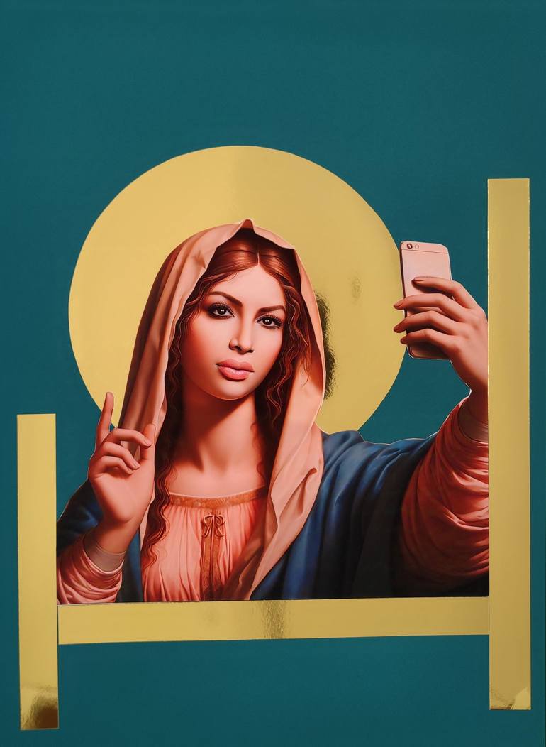 Exploring the Intersection of Religion and Celebrity Culture My current project has the overall title Comparative Mythology. It is a series of smaller series that highlights the complex interplay and the similar mechanics behind the two mythologies of religion and celebrity culture. This ongoing project, aims to examine the ways in which these two realms intersect and shape our modern society, ultimately challenging the boundaries of influence, adoration, and belief. By juxtaposing imagery from religious traditions and popular culture, I seek to initiate a dialogue about the parallels that exist between these seemingly disparate worlds. Through the technique of photomontage, I am able to merge and blend visual elements, creating compositions that provoke contemplation and reflection. Religion, with its deep-rooted beliefs and practices, has been a source of authority for thousands of years. In stark contrast, celebrity culture has emerged as a dominant force in contemporary society, captivating the masses with beauty, fame, and usually, talent. In this project, I examine how the influence and adoration granted to religious figures are paralleled in the realm of celebrities. I question whether society's worship of celebrities has become a sort of secular religion, replete with its rituals, icons, and devoted followers. Through my collages, I aim to challenge preconceived notions and provoke critical thinking about our society's values and priorities. By intertwining religious art like Byzantine Iconography with Pop Art and popular culture, I encourage viewers to reflect upon the blurred lines between the sacred and the profane, the divine and the superficial. I am particularly interested in exploring how the visual language associated with religion and celebrity converge. With the help of AI, a photo editing software, and traditional paper collage techniques, I aim to create new narratives and perspectives that provoke contemplation, critique, and possibly even a reevaluation of our own beliefs and the influences that shape our lives. Ultimately, my aim with this project is to spark conversations, provoke introspection, and challenge the way we perceive and interact with both religion and celebrity culture. I want viewers to question the power dynamics, the underlying motivations, and the impact of these intersecting forces have on our individual and collective identities.