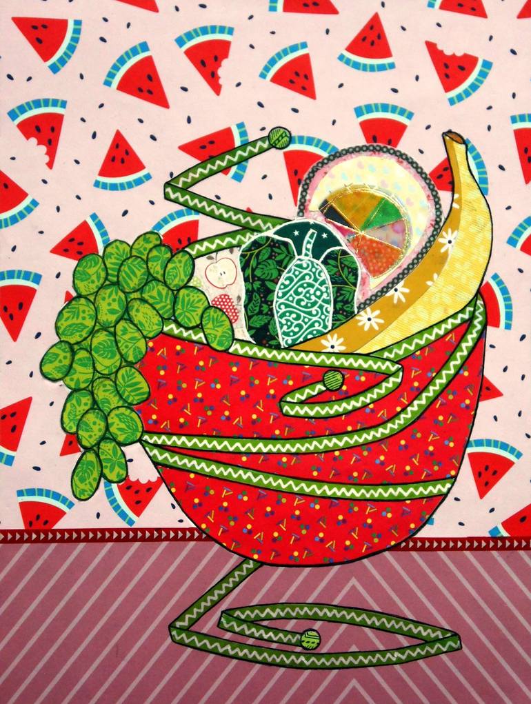 A whimsical bowl of fruit—green grapes, a banana, a grapefruit and a bell pepper—in a bright red bowl, with a watermelon background.