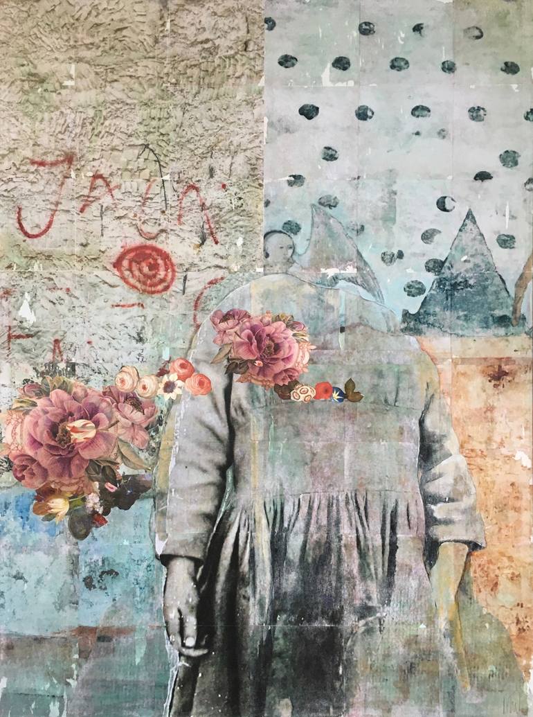 Mixed media composition on 130 x 97 cm canvas. Transfers, paper collage, pastels, acrylic and oil paint. The background is a detail of a destroyed church wall in Bihac, Bosnia (left) and a detail of a wall painting in the Saint-Salvator Cathedral in Brugge, Belgium (right). The contrasting nowadays...