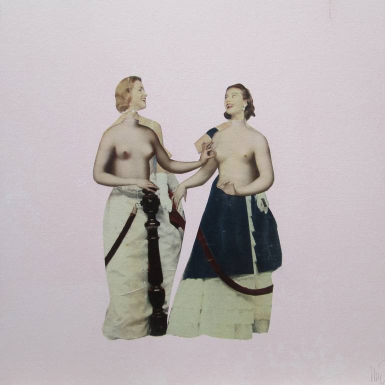 A composition in which two vintage models are placed in the center. Their chests are replaced by those of the Estrées sisters. This detail from the artwork ‘Gabrielle d'Estrées et une de ses sœurs’ is attributed to the Fontainebleau school. In this painting Gabrielle is represented, in the bath and ...