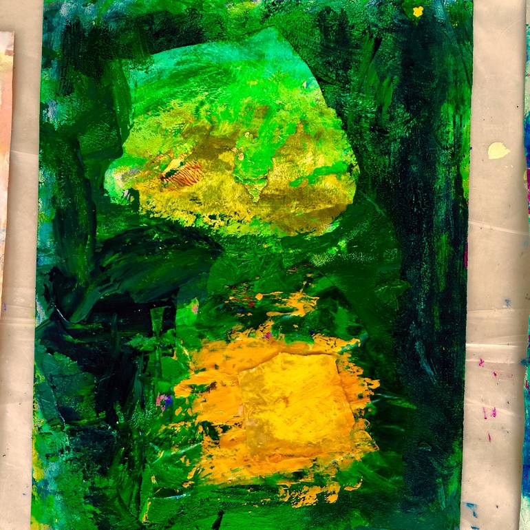 My painting is about materiality and entering into a quiet and luminous space. Again I have used a torn section from my cadmium yellow paint tube. The dark green oil marks were created as a contrast between dark and light and "paint as metaphor". This process allows me to push boundaries in my que...