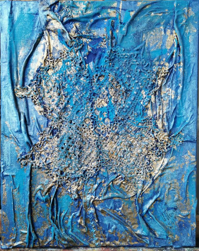 The combination of blue and gold colors, in my opinion, is ideal for such a composition in combination with these materials. I decided to expressively apply gold leaf (imitation gold) of part of the surface of the painting . This technique complements the possibilities of working with textiles. I...