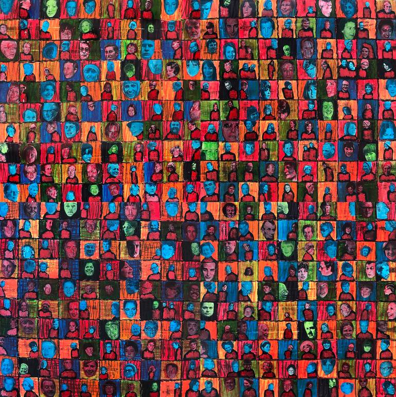 A grid covers the image; in each of the modules is a unique human figure. They look out of their colorful spaces; they also look colorful themselves. They create a carpet, a mosaic of a random pattern. I want the viewer to see this picture in their way. I don't want to tell him the tracking path. I ...