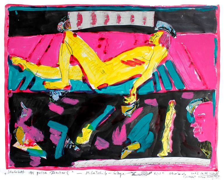 This captivating collage, "Great Thinker's Deathbed," began as a simple pencil drawing, a study of the human form in repose. The artist then built upon this foundation with layers of vibrant color and texture using gouache and acrylic. The visible broad brushstrokes add depth and energy to the compo...