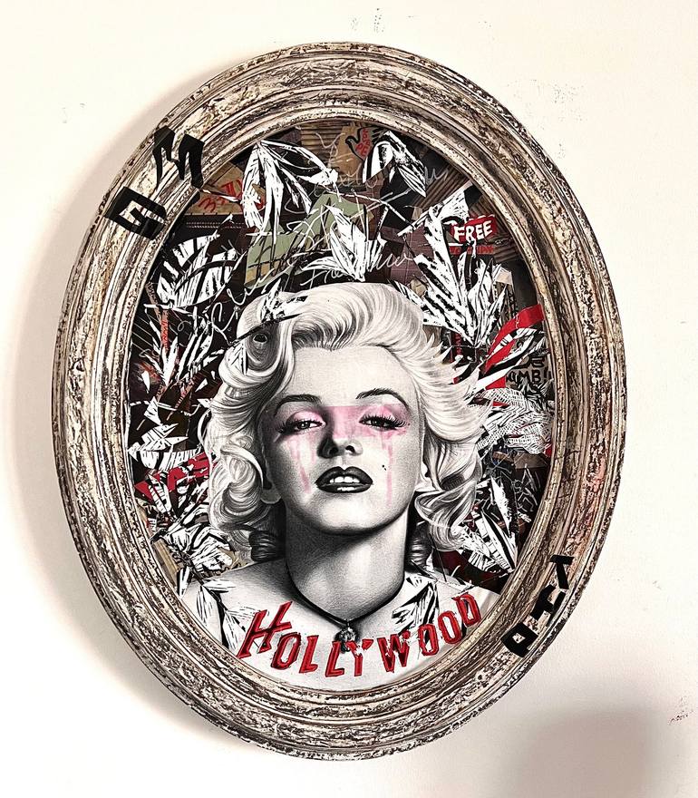 Hollywood cry is inspired by the story of Mariyn Monroe, a fragile woman in the destructive mechanism of Hollywood. The mixed media & collage work was executed on an original walnut and glass frame from the early 1900s lacquered "Arké"