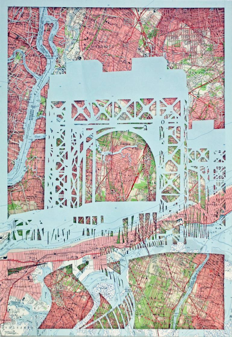 Dissected U.S. Geological Survey Maps 1:24000 scale map of New York & Vicinity c1955 &1957 interwoven with a template of the Harlem Lift Bridge. One in a series of 10 New York Bridges. Private Collection.