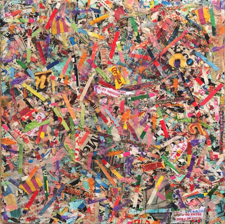 My impression of the colors, energy and texture of Mexico. Torn paper and a bit of paint on wood panel. Modern clear maple box frame.