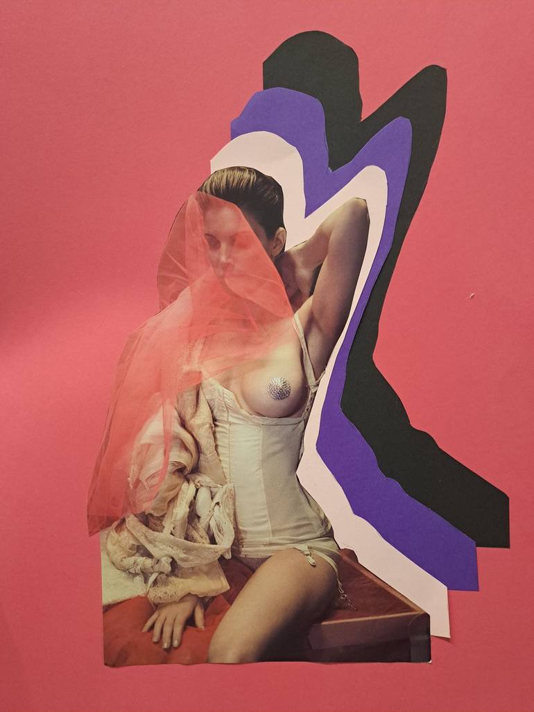 I kept the magazine that this image comes from for years as it was a special edition. I vowed to let no damage come to the magazine. However I love this image so much that I just had to use it for this simple collage. The model sits atop wearing a corset with her left arm up wearing a nipple cover ...