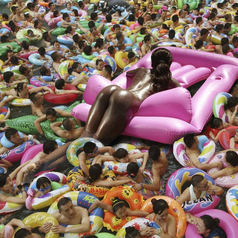 In the heart of a bustling Chinese wave pool, where throngs of swimmers are packed together, each buoyed by their colorful floaters, a remarkable figure emerges. Amidst the sea of humanity, a giant woman of color reclines, her nude form suspended effortlessly in the water, her face concealed from vi...