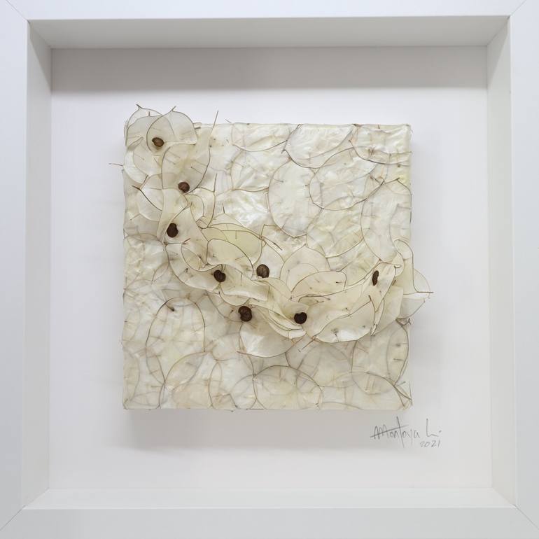Nature provides us with complex and beautiful forms and I like to take some of those and give them a human touch by disposing pieces to make different compositions. This piece is a collage with honesty (lunaria) seed pods.
