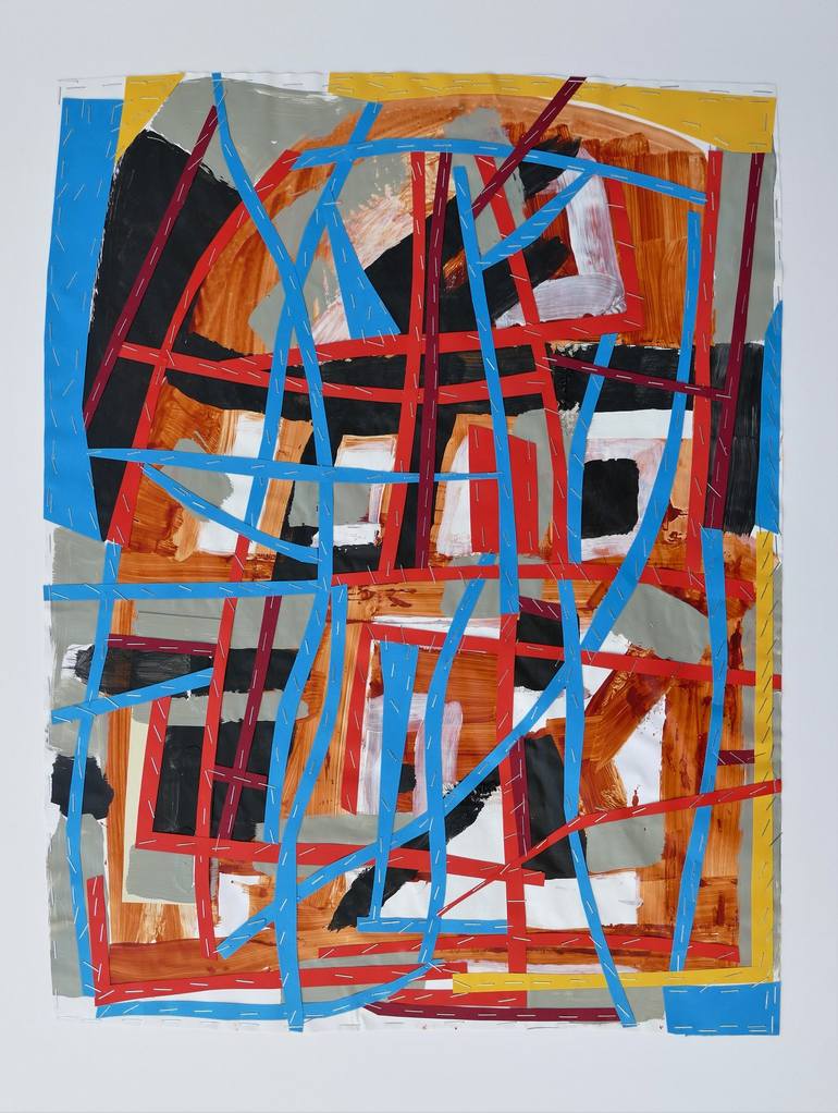 This original abstract collage, "Houses - Building site", is a fascinating exploration of form and texture. The artist uses paint and paper to create a dynamic composition with two distinct layers. One layer is carefully painted with a brush, while the other features a collage of sharp lines, sugges...