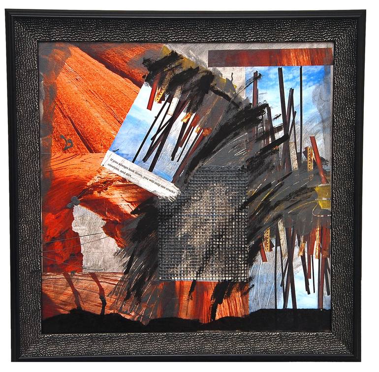 Mixed media using found objects, paper, & paint.