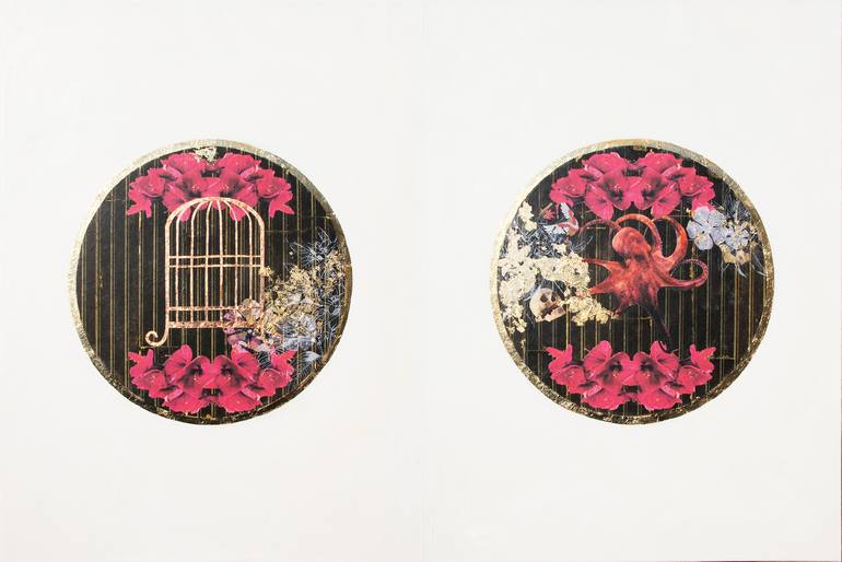 This work is a union of different techniques, the inspiration is a Victorian game, the thaumatrope "spinning of wonders" The orange octopus is imprisoned in the bronze colored cage. Spinning the game quickly, the animal appears to be trapped, this optical illusion was one of the ancient games that I...