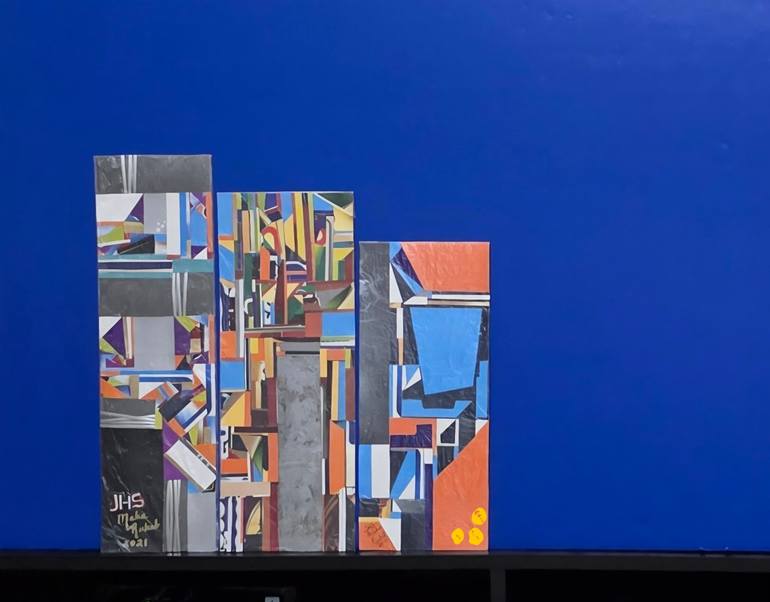 This modern collage artwork, "Introspection. The Entirety of Divine Truth," is a mixed media triptych on cardboard and paper, that can be displayed as one panel or separately. "Pray to the Lord for it, because if it prospers, you too will prosper.” Jeremiah 29:7. Measurements are as follows: Praying...