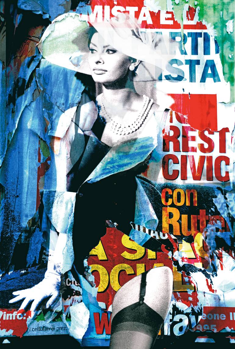Rome, 5th October 1964. Inspired by the decollage of Mimmo Rotella, Brivido Pop physically and digitally tears and rips billboards around the city to expose, layer after layer, an overlapping that is a century-old and discovers unprecedented and fascinating combinations. It is an aesthetic short circuit, a bizarre but ingenious slot machine. The final product is a digital "ricollage" printed on canvas (edition limited to five copies) and enhanced with genuine peeled paper that blend into the photographs so as to further confuse the eye… “I like watching people walking down the streets to find out aesthetic resemblances matching the classical art works” Final participant of Saatchi Art Showdown for ‘Pied-a-terre’, Paris 2011. Featurings on Saatchi Art’s hompage: Piloni & Veline featured in the "Statement Art for Above a Sofa" , 2015 Divine Creature featured in the “Inspired by Old Masters” Collection, 2015 Una Fame da Squali featured in the 'Hollywood' Collection, 2015 Fronte Retro featured in “The Figures et Nudes” Collection, 2012