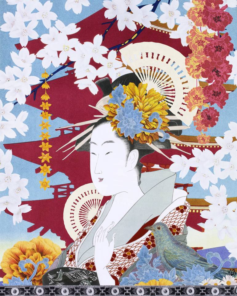Katell Le Bourdonnec is a French artist based in California (Santa Cruz) and Paris. "I strongly believe in the beauty of everyday life. I also think that this beauty can be enhanced in many ways. Creating art allows me to explore other territories aligned with my vision of a more beautiful world. As a child my parents were always taking me to fine art museums where I developed a passion for the European masters and for the Orientalists in particular. The images in their paintings fueled my desire to discover distant lands. As an adult I had numerous opportunities to travel throughout the world which further ignited my love of different cultures. I like to create art that is colorful and exotic, the essence of which is joyful and edenic. I'm particularly touched by the beauty of women and the beauty of flowers. They have become my main subject matter. Today I mostly paint and make collages. In my collages I use a variety of materials including papers and Swarovski rhinestones… I am continually collecting all types of papers. They come from the walls in the streets of Paris, from magazines, from antique fairs and flea markets, and from everywhere I travel."