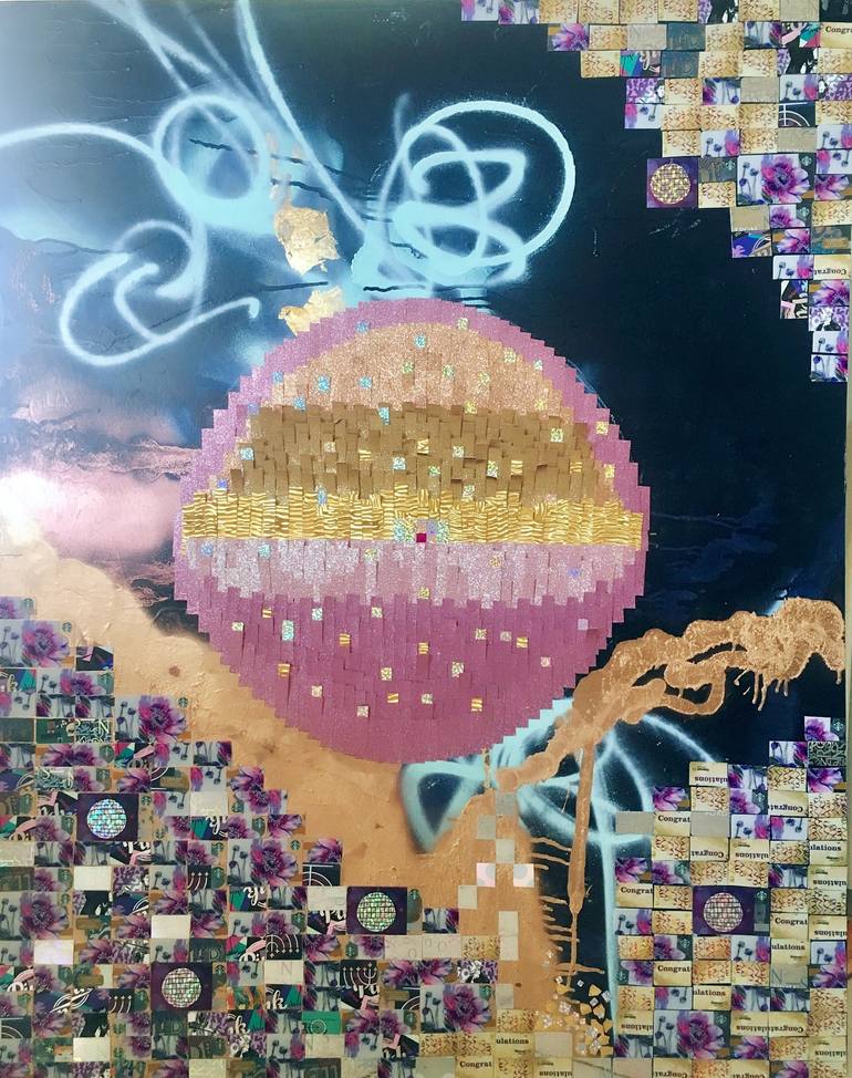 Paper, plastic, resin on the wood panel. La Fiancee du Mekong # 6... Collection The rising sun on the Mekong River as the center of the Universe. Pure energy, the soul of the wise in the midst of floating markets. Infinite light on the temple, connection to the Divine. Be... beyond the Mekong, bey...