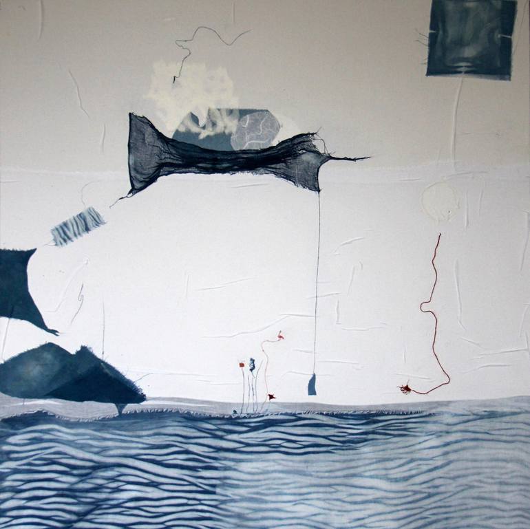Le bleu de la mer, de l'air, du ciel... la liberté ne tient qu'à un fil. Marouflage de textiles et papier, teinture à l'indigo