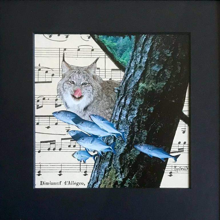 Lunch time! A kitty dreaming on fish? I hope he gets them all! I love animals and I believe in dreams and imagination. Old magazines and paper cuts come alive when the idea is to reach many by means of a paper composition. Here the antique music chart serves as background of a happy scene. Great sho...