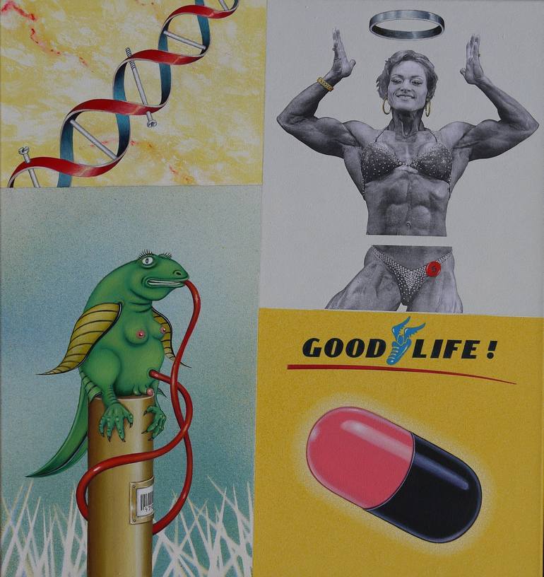 Good part of work is traditional style acrylic on canvas painting. The bodybuilder lady is basically collage, augmented with painted details.