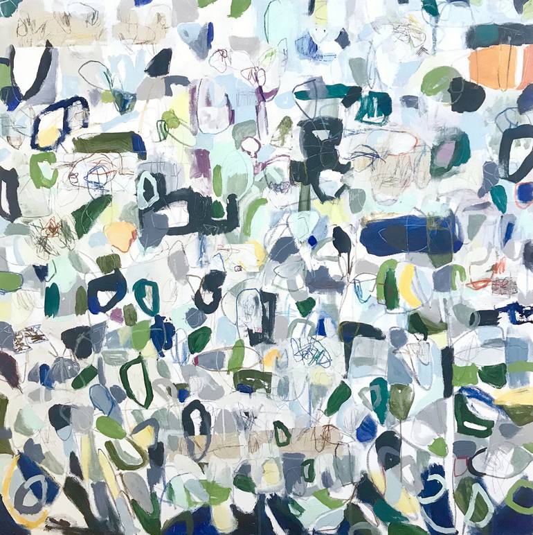 This painting invokes some of the darker, evening shades in my garden. I worked with abstract forms, collaging some drawings on paper and responding to the shapes and lines as they happened. The focus here is really on the soothing qualities of the colors along with the underlying energy of the draw...