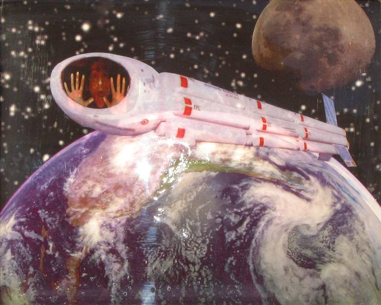 Inspired by David Bowie's "Space Oddity," this one of a kind collage captures the helpless feeling of "floating in a tin can." Brekan poses against the glass as a dreaful Major Tom over a spiraling Earth below. The new moon hovers ominously as the capsule appears to rocket away from home. The o...