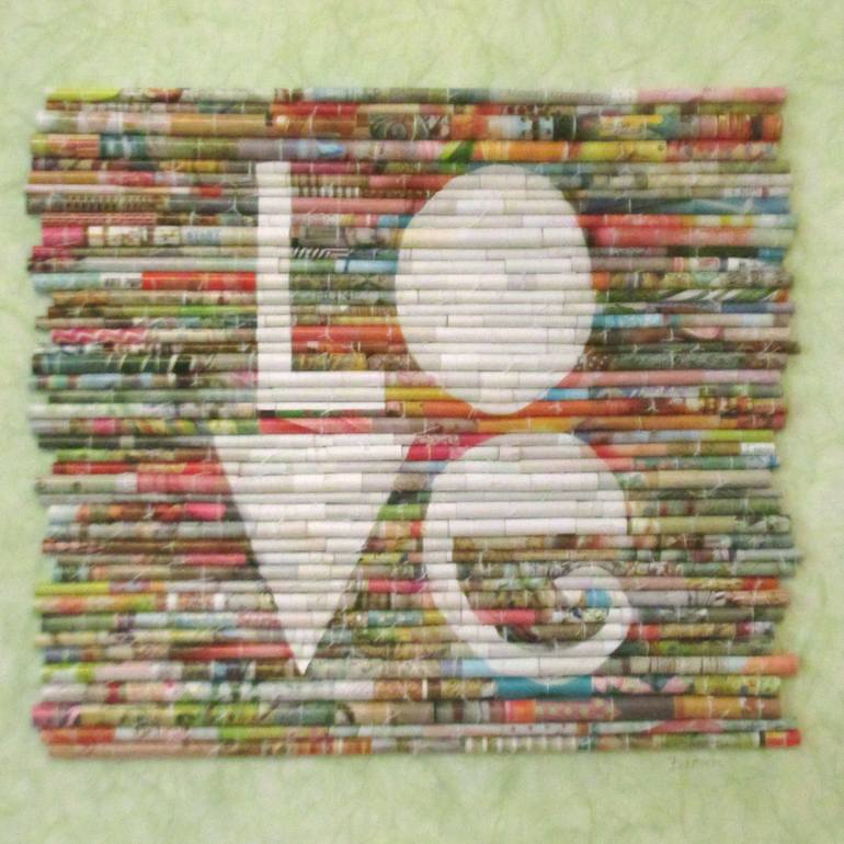 This is a fun, unique and vibrant piece of art. I use cut strips of magazines, or “rags” to create paper spools, which I lay on their sides and adhere to a background to create the finished image, spelling out the word "LOVE". The background of this piece is a beautiful sheet of pale olive green han...