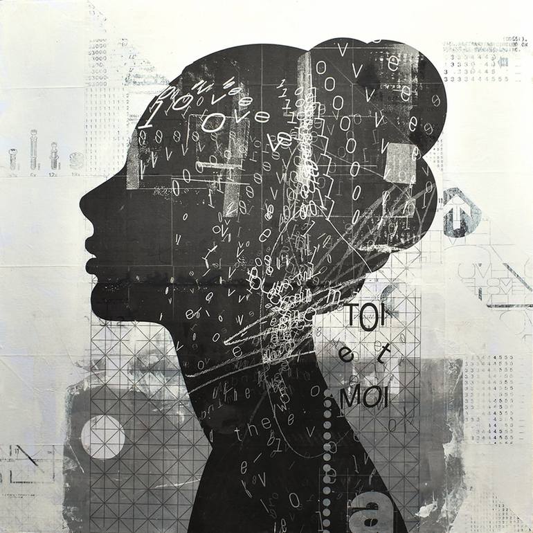 Mixed media: collage, acrylics and transfer. "Love in Black" is a captivating original collage that harmonizes abstract and figurative elements. A black silhouette of a female figure merges with alphanumeric characters and geometric patterns, creating a visual dialogue between humanity and technolo...