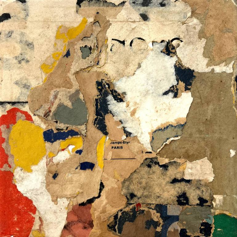 Torn posters on canvas. Part of a series made from old posters (years 50-60)collected in Paris subway station 'Marcadet-Poissonniers'. 'Champs Elysées - Paris' partly visible