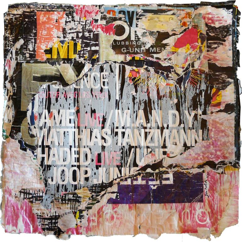 Torn posters glued together. Part of the MPL series made from posters collected in Montpellier (South of France) There is no support in this piece to preserve the raw appearance of the material and integrate the border as an element of the creation. It hangs on a wall like a tapestry. Two eyelet hol...