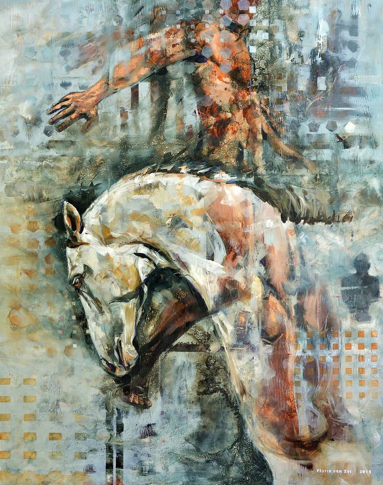 1220 x 1520mm, 48 x 59.8inch Mixed Media and Oil on Canvas. This Artwork started out as a collage of the male aspects of society, spirituality and the physicallity thereof. A male nude was the main figure with the masculine power of a horse the main feature over that. The background is filled with i...