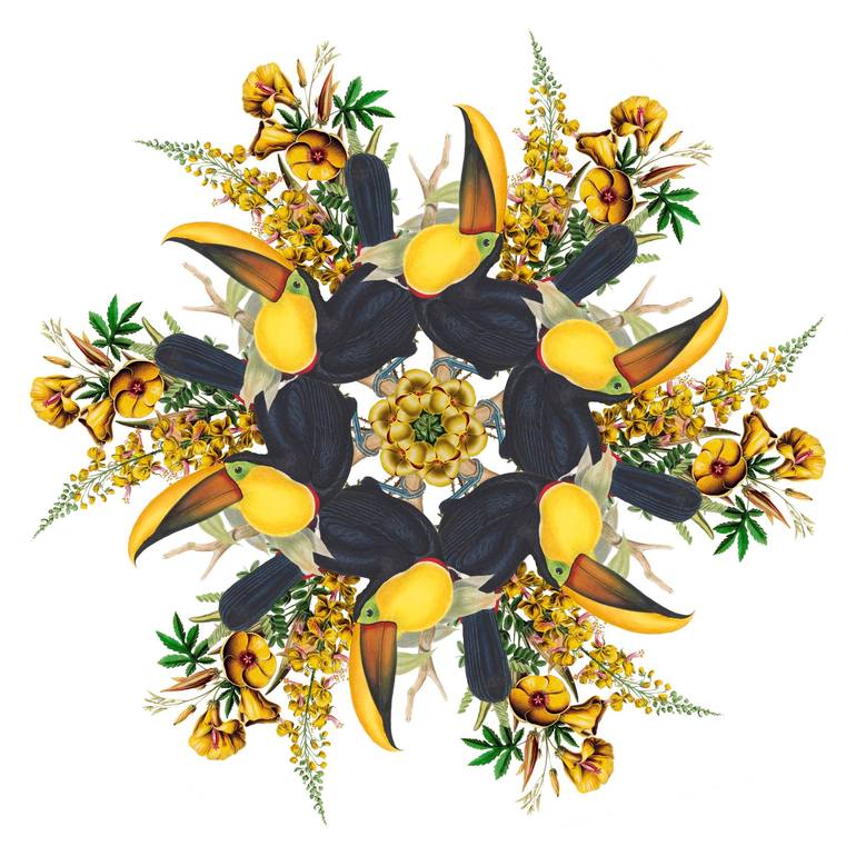 Digital mandala, collaged from public domain botanical and avian specimen illustrations. Mandala 8 incorporates allamenda, okra, bresillette, and yellow-throated toucan