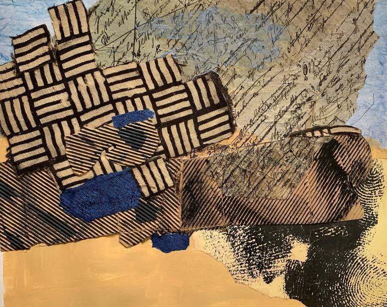 I have traveled to 22 African countries and many times to Mali for non-profits working with tribal groups to create crafts. Here is an actual piece of African mudcloth, plus thumbprint paper that reminds me of the Saharan desert. I added printed with writing wrapping paper and then tore up cardboard...