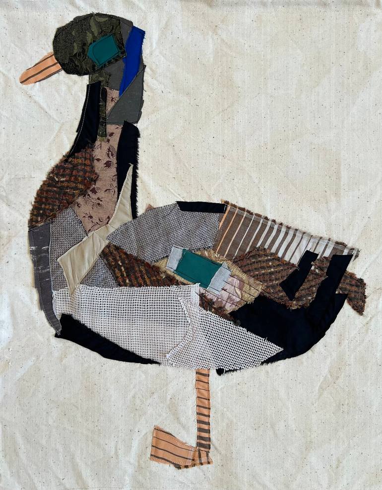 This textile panel is part of a series that includes works featuring a rooster and a hen, created in the textile collage technique. On thick, natural-colored canvas, fabric scraps of different textures come together to depict a charming duck. The edges are left unfinished, adding a casual, light fee...