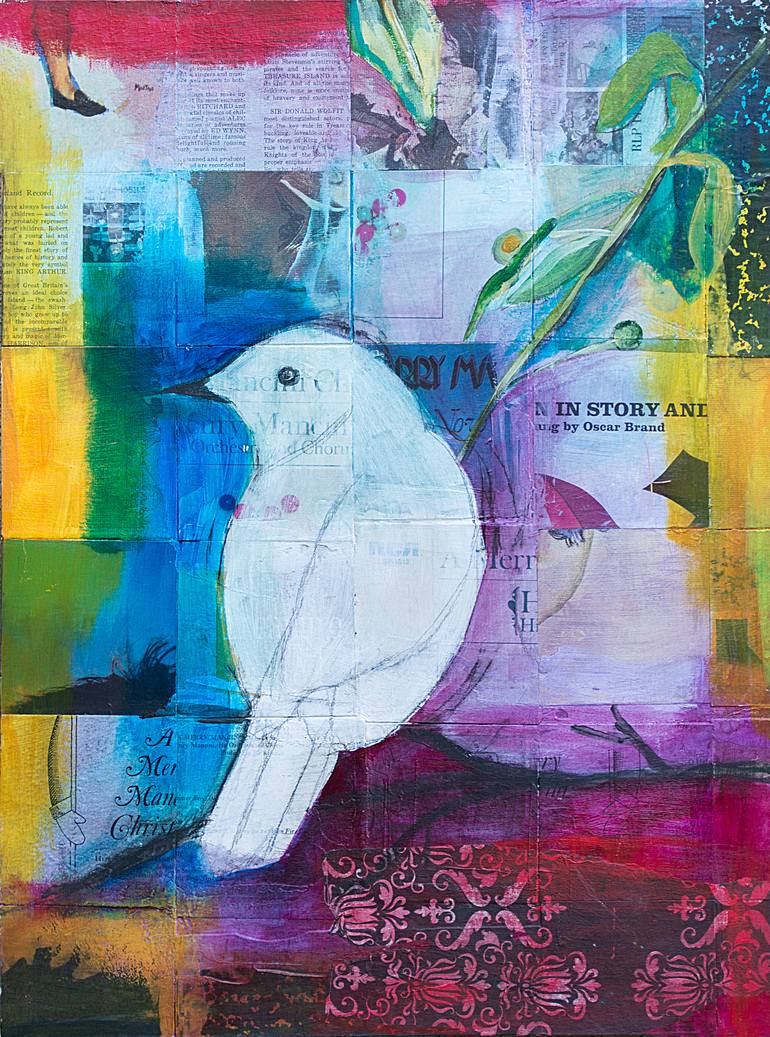 When I was a child my parents would take our family on nature walks and point out and identify birds. As an adult I feel drawn to the subject of birds, their lives and their environments. The birds I observe here, Blackbird, Blue jay and Mourning Dove, are similar to the ones in my homeland. Just as birds gather pieces for their nests, I gather paper pieces from fashion catalogs, old books, music notes, maps, wallpaper sample books and more to create my birds. I also get inspiration from the flora and fauna outside my studio window. Finding shrubs or a branch that creates just the right environment for the assembled bird. I use scrap paper, acrylic paints and found objects on wood. I am a graduate of Beit Berel College, School of Art in Israel. I work, teach and play in my California base studio.