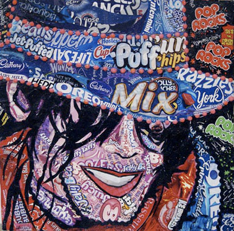 "Wrapper's Delight" is my newest series, using torn, cut, and expired candy wrappers to render my subjects in diverse and colorful forms. My work is inspired by food and the carnal delight of candy, in which gluttony is given a new, humorous, and often playful, meaning. My subjects are celebrities...