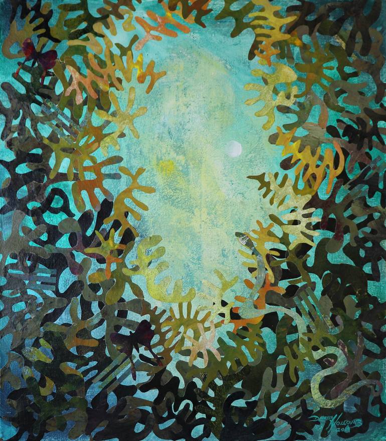 "Midnight", 2019, acrylic and cut paper on canvas. This picture wanders between abstraction and a surreal midnight landscape, as organic forms suggestive of plants and animals romp through a moonlit forest. The picture is unframed, painted on a deep back-stapled "gallery wrap" canvas, needing no f...