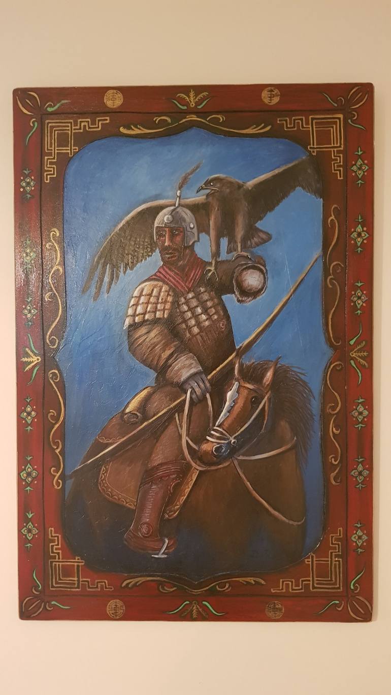 Inspired by Mongolian horsemen. Painting on wood panel with Mongolian border details