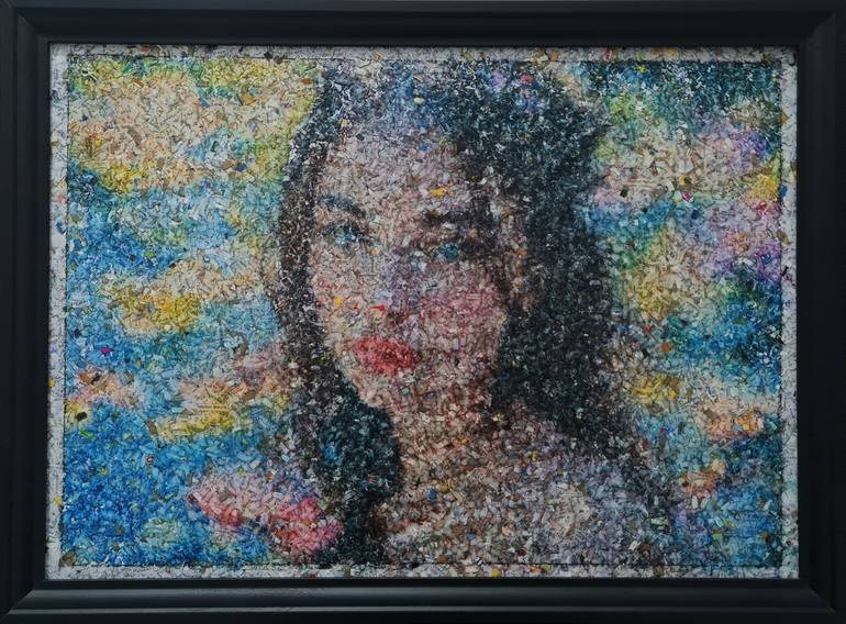 My works are made using thousands and thousands of little pieces of paper that, assembled together with acrylic colors, give life to figures. In my recent works I am exploring the female universe and their figure of women treated like "dolls", too often victims of violence: "not your doll" is the title of the series. With these works I try to interpret the emotions of women who wear these clothes and would like to shout out their anger to the world, but unfortunately many cannot do so. So I try to identify with them, shouting out their anger and their desire for redemption to the world for them. The sharp looks of my subjects shout out anger in their sweetness, in their expressions composed of thousands and thousands of little pieces of paper with the words of their daily life written on them. Finally, in my latest works, there is always one or more little pieces of paper with the hashtag "#FreeIran" written in support of the daily struggle that the female universe must currently sustain in a beautiful country rich in history such as Iran. Finally, since my works are all composed of recycled paper, I transform garbage destined for the waste paper bin into emotions.