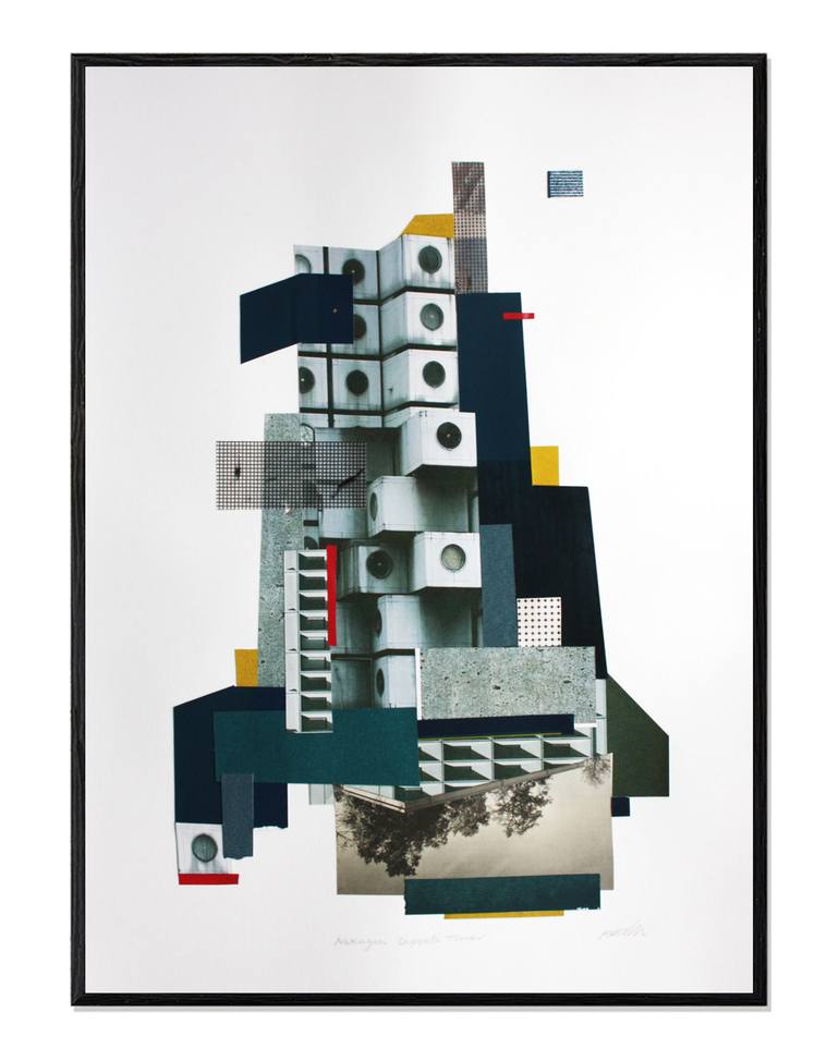 Nakagin Capsule Tower is a collage inspired by brutalist architecture. Featuring Nakagin Capsule Tower building photographed in Japan. Old screen prints, acrylic pencil and magazines were used to create this image. 420 x 594 mm made on 220gsm acid-free paper, signed in pencil.