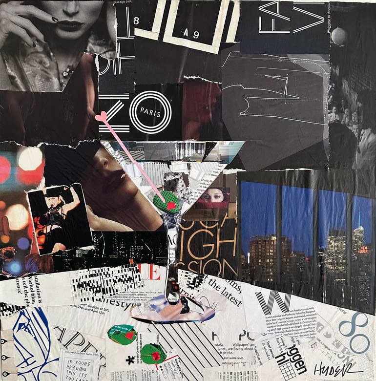 A vibrant collage blends elements of fashion, urban scenery, and various text snippets, creating a dynamic and intriguing composition. Central to the piece is a martini glass with a pink straw and green olive, adding a playful touch to the otherwise monochrome elements. The mixture of photography, t...