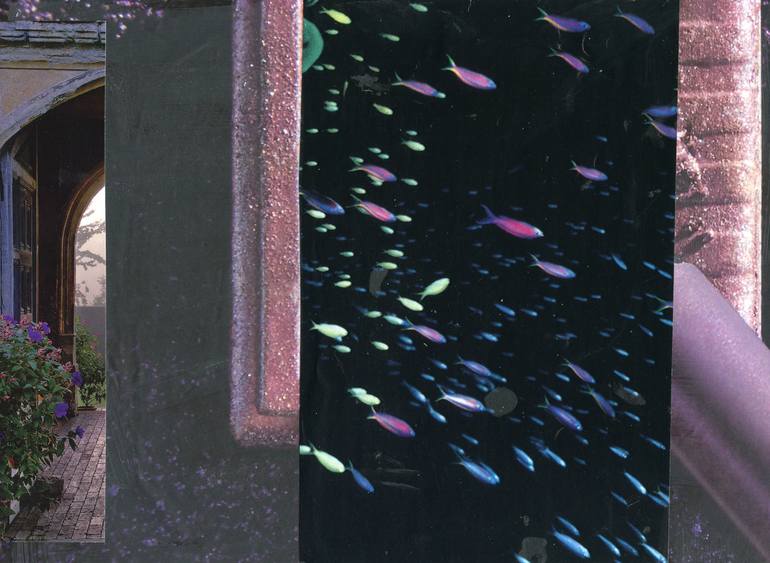 Immerse yourself in the depths of "Night Swim," a captivating paper collage on mat board. The abstract composition features a mesmerizing interplay of black, blue, and violet hues, evoking the mystery of a nocturnal underwater scene. Hints of dark shapes resembling fish add a touch of intrigue to th...