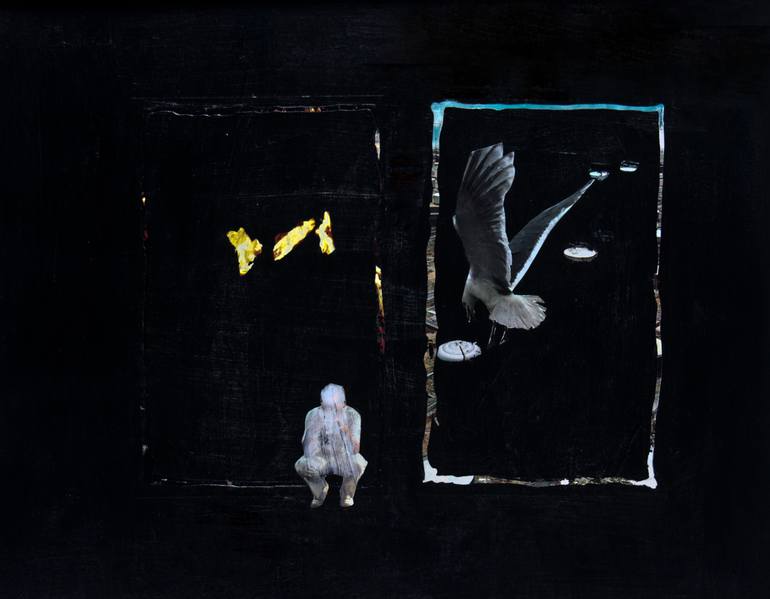 This original collage, "Ominous Pieces 8", is an intriguing abstract composition created with acrylic paint and collage elements on sturdy paper. The artist's intuitive process shines through, resulting in a harmonious balance of color and form. The work is signed and comes with a certificate of aut...