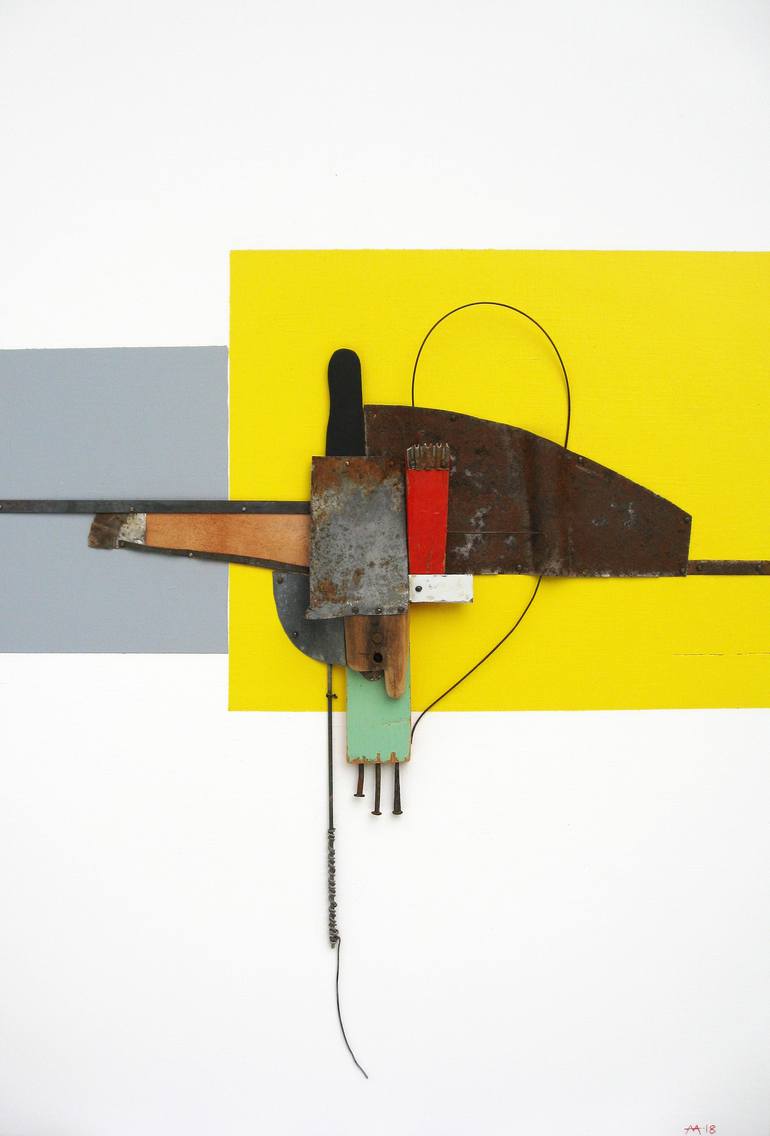 Abstract mixed media piece created with oil and latex paint, wood and metal on plywood board. 24"x16"x.75"