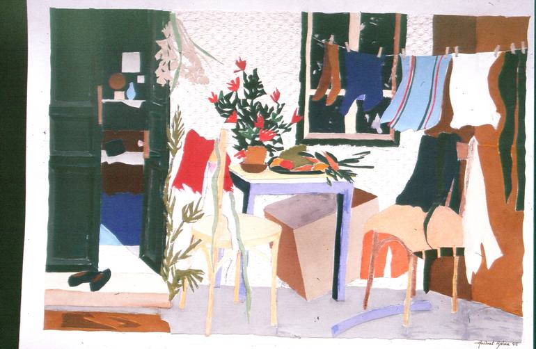It represents the entrance of a house in the village side in Lebanon, where the owners of the house have displayed their clothes outside their home.