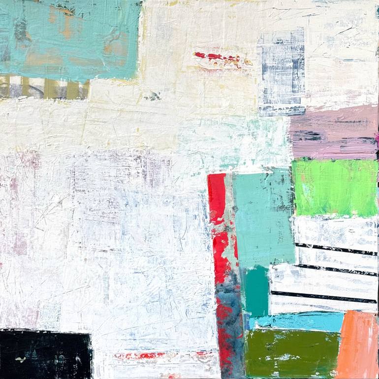 "Outer Plains" is an original abstract collage that captures an intuitive dance of line, form, shape and color. Acrylic paint and collage create a bold, geometric statement. Pastel textures and bright colors meet angular lines and cubic forms, brought together using expressive brushstrokes. Negative...
