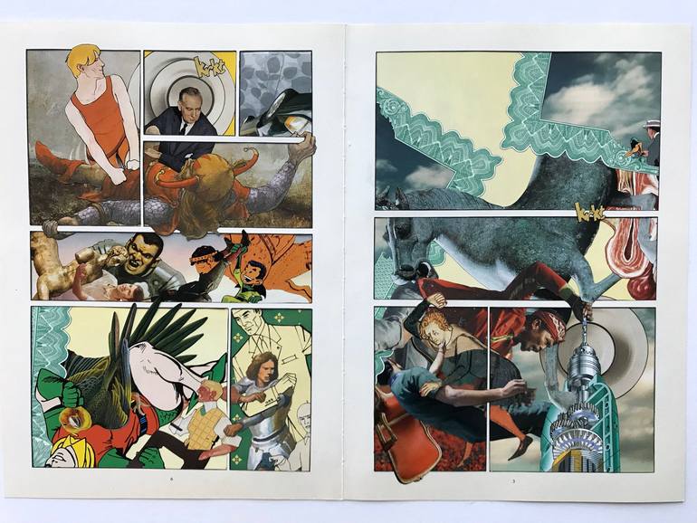 Hand-cut paper collage assembled with archival glue and tape. The framework for this collage is taken from a large graphic novel. Dozens of elements interlock amongst each other and in and out of the panels.