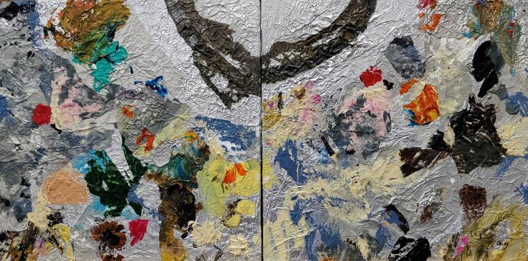 During this time of corona, isolation in my apartment with my small studio has inspired me to create with the objects I have around me. The aluminium foil used over the last two years as my painting palettes has in itself become a creation confined in a new/old space.