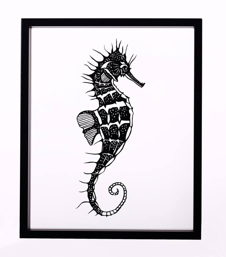 This seahorse silhouette is a unique handmade paper cut. It is placed between two glasses (in a frame), so you can see the seahorse's shadow on the background/wall. It was inspired by a theme of curls, curly tails. It is part of the collection of "curly" animals: squirrel, chameleon etc.