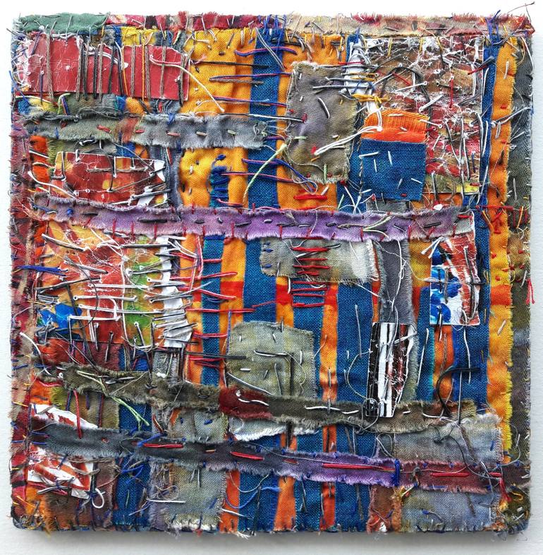 I live and work in South West London. My passion is for colour and textiles. I have always painted, experimented with making things and played creatively. I adore using fabric because of the way it holds and reflects colour. Textiles are versatile and allow for the use of many experimental processes which are fascinating. I am interested in subtle perception of tactile qualities in my work. I experiment with many techniques of applying colour and texture in layers to achieve a complex surface. I work in an intuitive and abstract way. The result of this work is often about themes of movement, energy and elements. I love to garden and I have a view of it from my studio. The changing colours, weather and patterns are a constant source of inspiration.